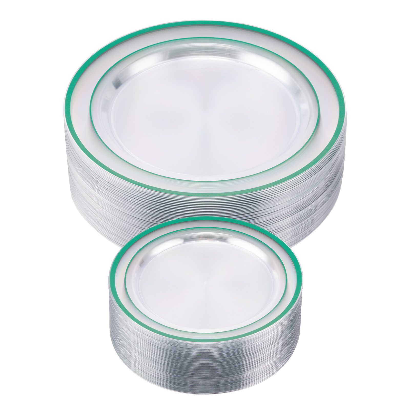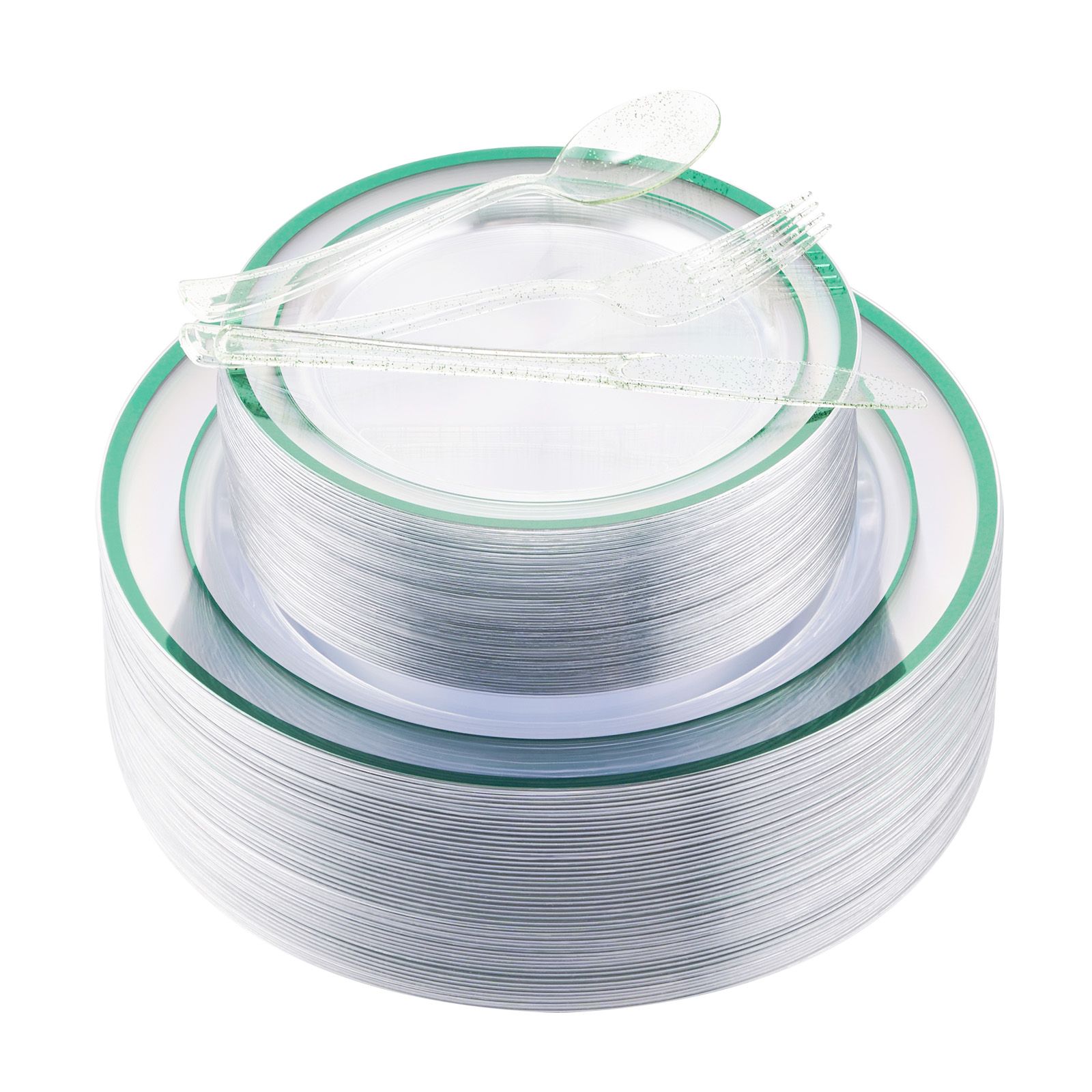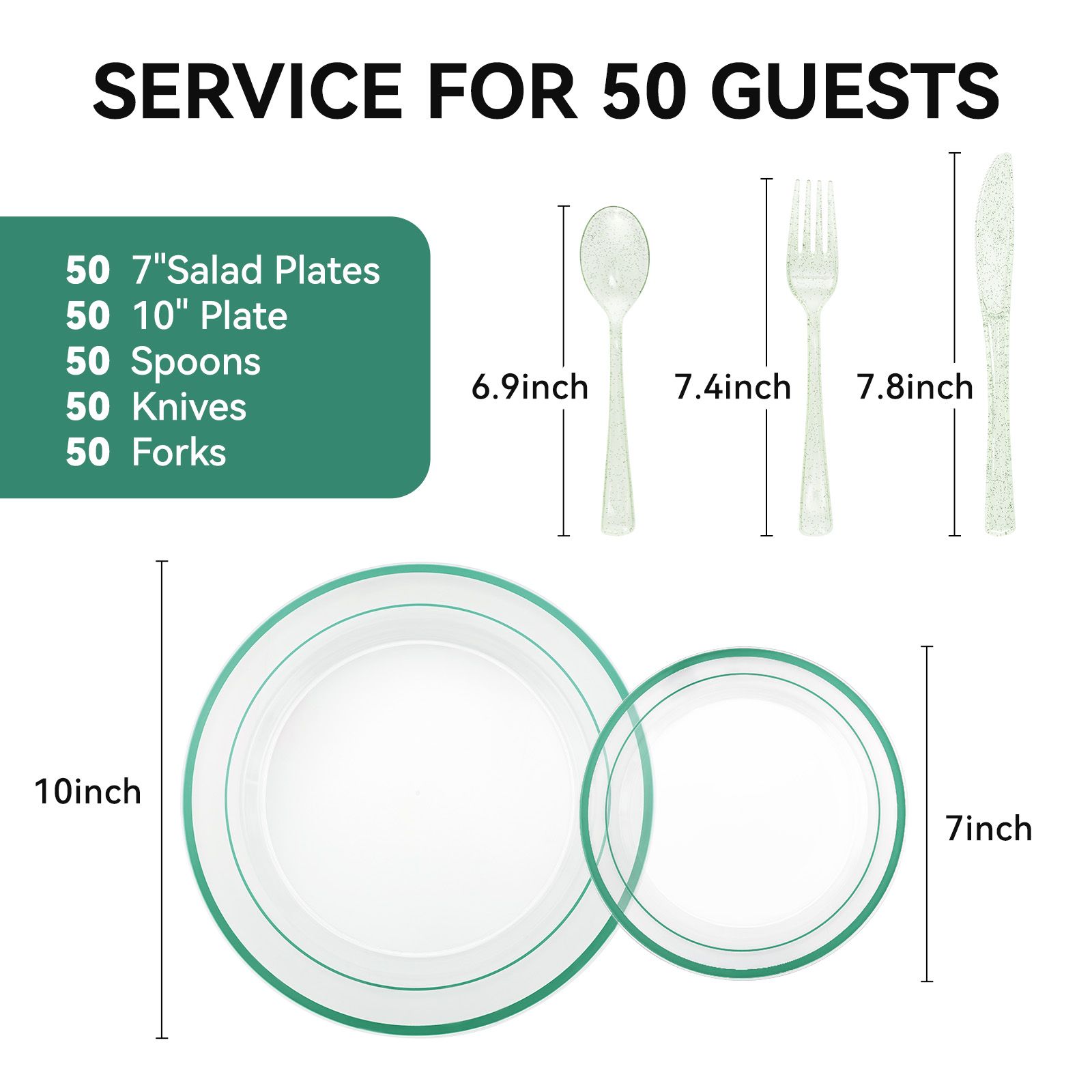 7-inch green-edge transparent base (17g) + 10-inch green-edge transparent base (39g) + transparent green powder knife + transparent green powder fork + transparent green powder spoon. Packaging: 50 servings per inner box, suitable for group meals (more than 50 people), Plastic is of high quality, thick material and durable