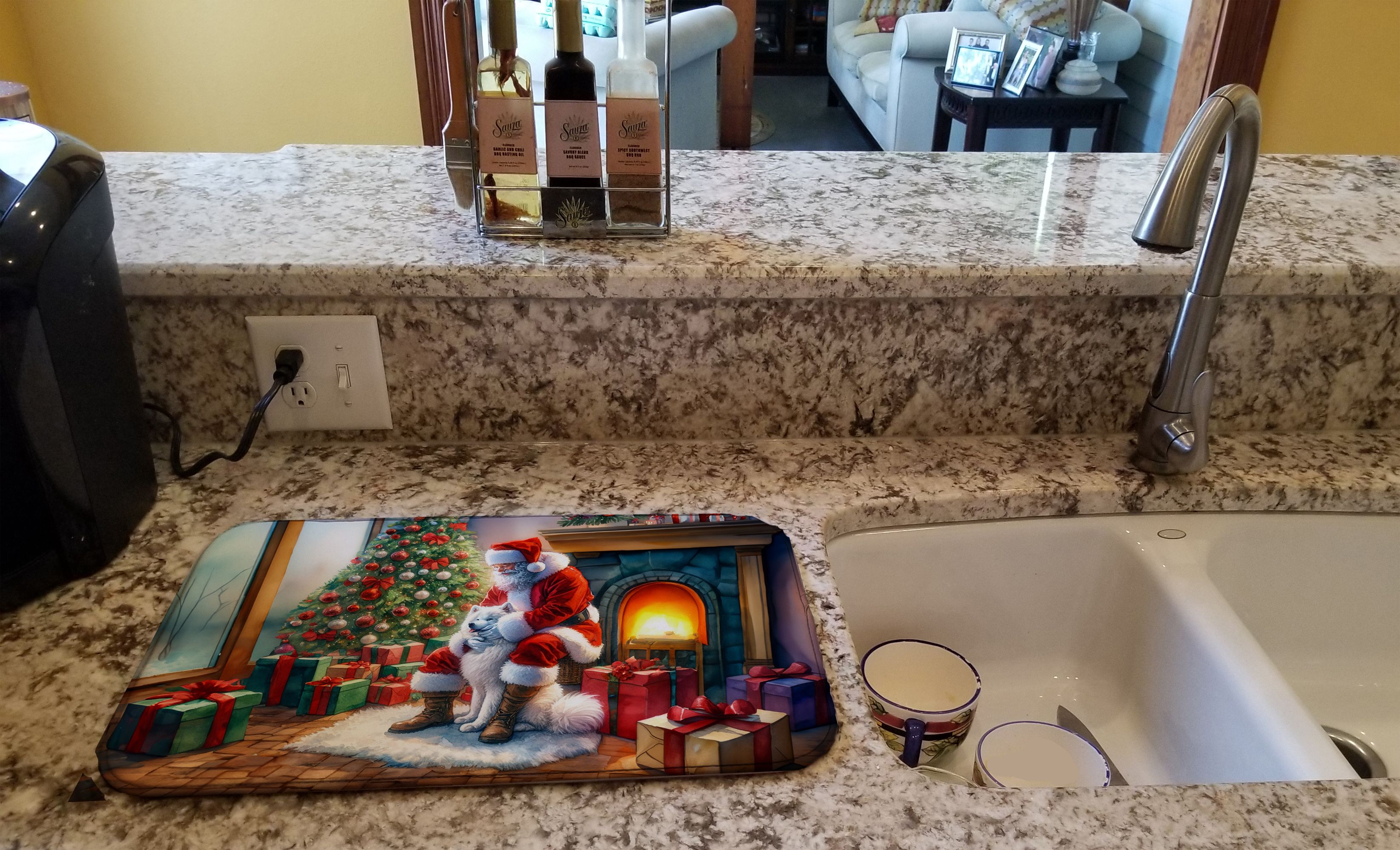 Dish Drying Mat featuring breed specific Samoyed artwork. Celebrate Christmas with this Christmas Dish Drying Mat. Say goodbye to messy countertops and soggy dish towels with our innovative dish drying mat. Our high-quality dish drying pad is designed to keep your countertops dry while offering a stylish and efficient solution. Whether you're air drying dishes, glasses, stemware, silverware, pots, pans, bottles, or even fruits and vegetables, our dish mat is the perfect choice. The 14 inches x 22 inches size fits most counters and dish drying racks, and the non-slip design ensures stability. Made with water-absorbent polyester and a polyurethane foam insert, our dish drying mat is not only functional but also durable. It's machine washable and printed in the USA for long-lasting use. The beautiful artwork adds flair to your kitchen decor, making it a perfect housewarming gift or present for any occasion. Upgrade your kitchen experience with our absorbent and versatile dish drying mat.