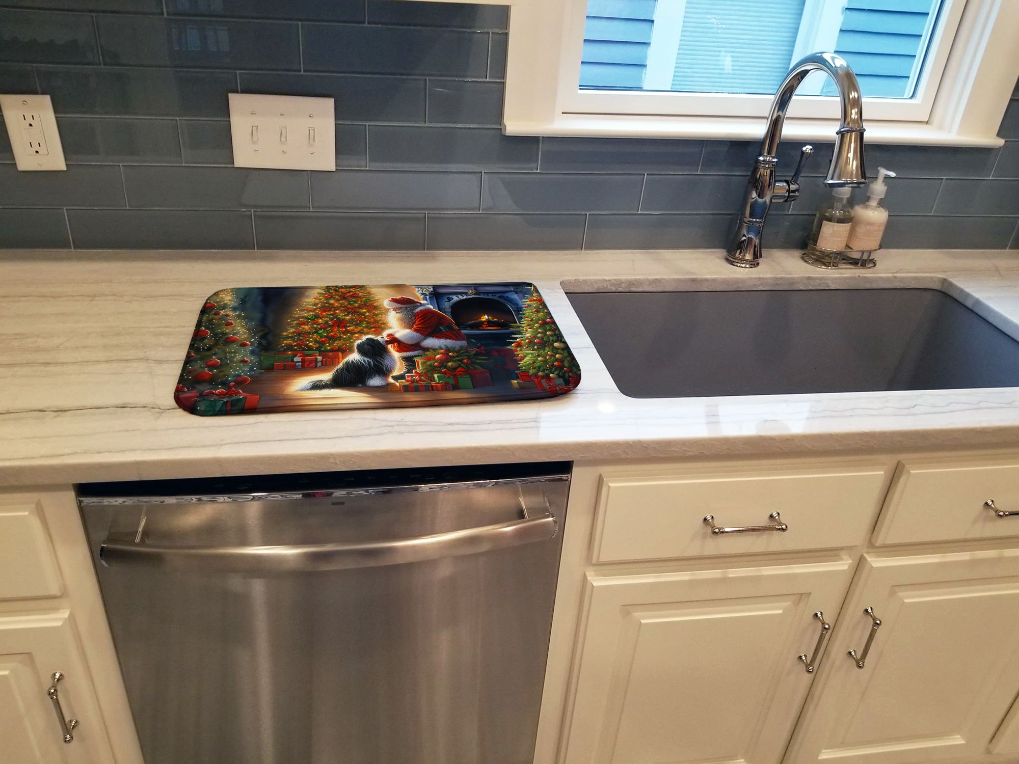 Dish Drying Mat featuring breed specific Tibetan Terrier artwork. Celebrate Christmas with this Christmas Dish Drying Mat. Say goodbye to messy countertops and soggy dish towels with our innovative dish drying mat. Our high-quality dish drying pad is designed to keep your countertops dry while offering a stylish and efficient solution. Whether you're air drying dishes, glasses, stemware, silverware, pots, pans, bottles, or even fruits and vegetables, our dish mat is the perfect choice. The 14 inches x 22 inches size fits most counters and dish drying racks, and the non-slip design ensures stability. Made with water-absorbent polyester and a polyurethane foam insert, our dish drying mat is not only functional but also durable. It's machine washable and printed in the USA for long-lasting use. The beautiful artwork adds flair to your kitchen decor, making it a perfect housewarming gift or present for any occasion. Upgrade your kitchen experience with our absorbent and versatile dish drying mat.