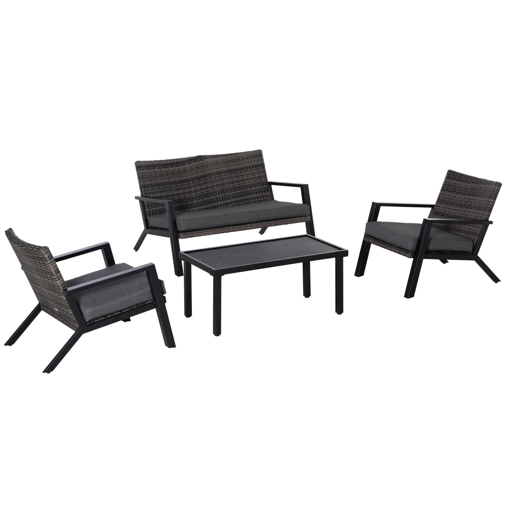 This four-piece rattan patio furniture set brings indoor dining comfort to your backyard. Everything is there, a loveseat sofa, two chairs, and a metal table. Each seat has a thickly padded cushion allowing you a cozy spot outside. Invite over guests; with an outdoor table, you have a space for dinner, drinks, and decorations. Made of water-safe PE plastic and a supportive steel frame, this outdoor set was handwoven with outdoor in mind. Get out, get comfy, get Outsunny.