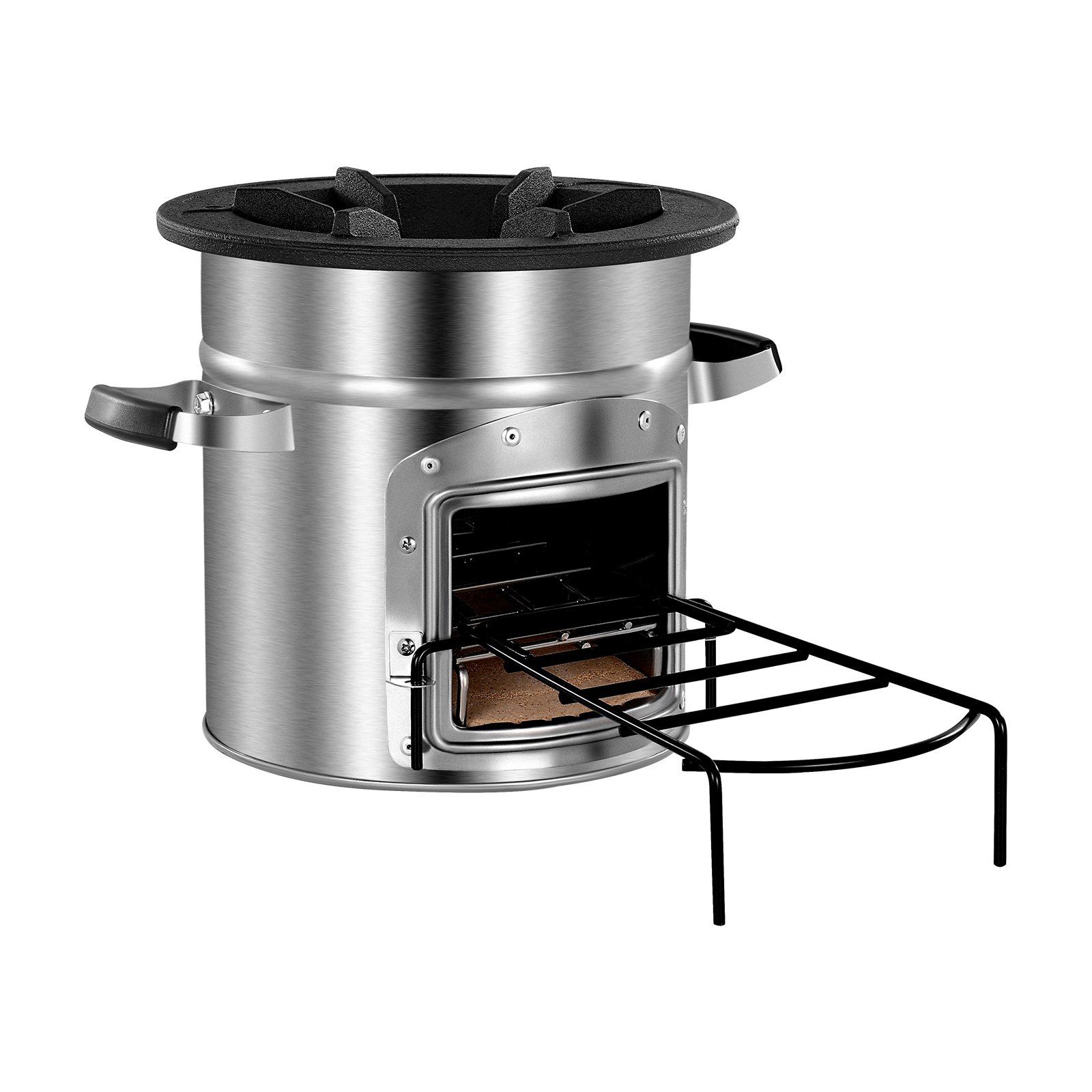 3.Cooks & Heats with Real Flame: Cast iron top supports pots and pans while ensuring even heat transfer. Our wood burning rocket stove is ideal for boiling, frying, or simmering in the wild